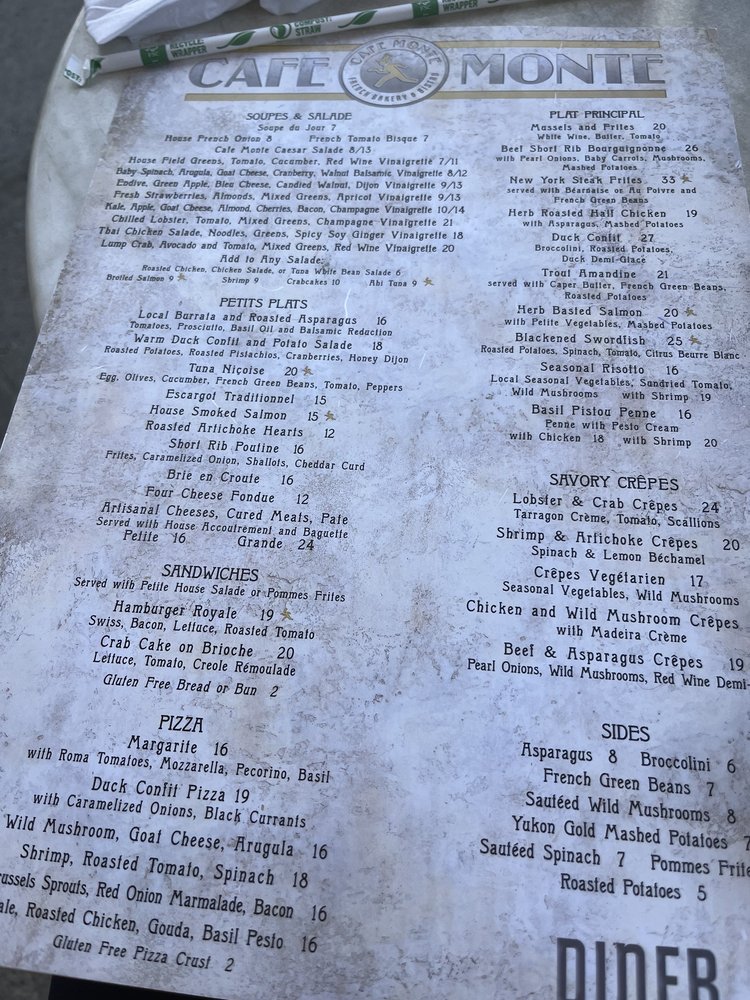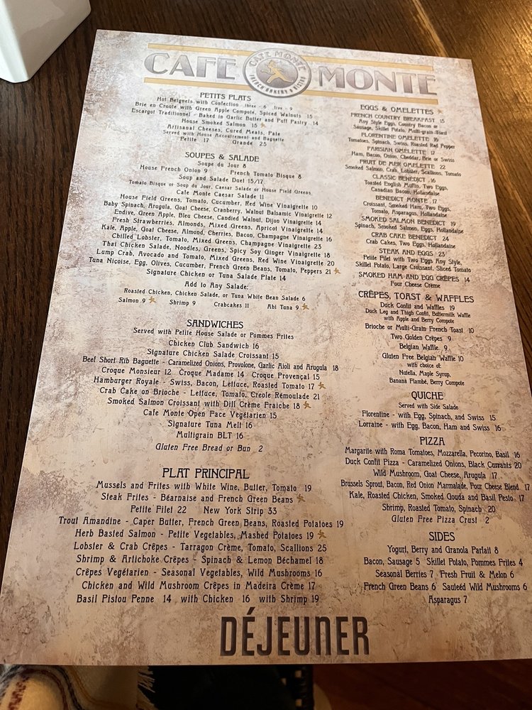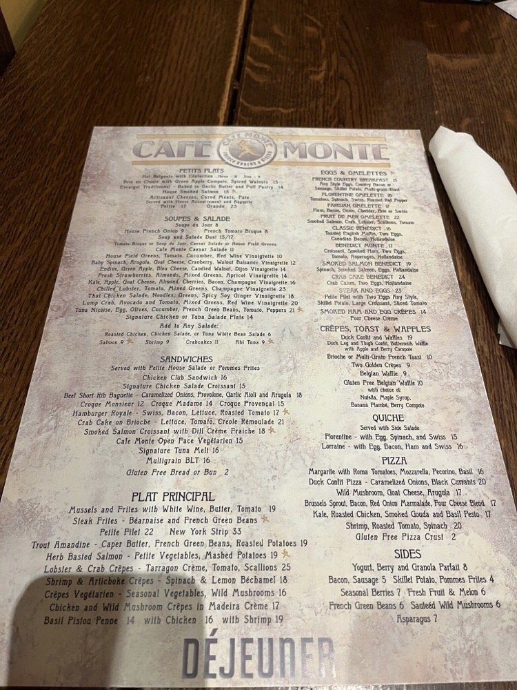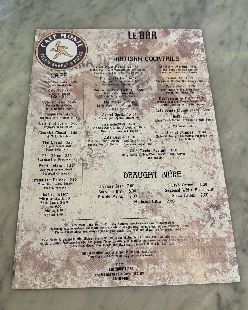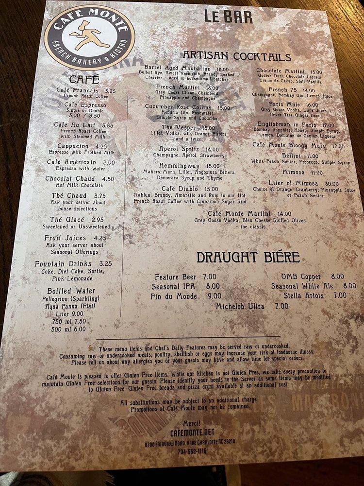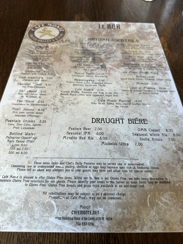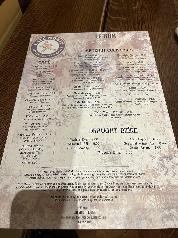 Cafe Monte, a charming French bakery and bistro in Charlotte, offers a delightful menu with an array of options suitable for various dietary needs. The ambiance is described as romantic and classy, perfect for a relaxing meal. Customers rave about the delicious dishes, from juicy duck to flavor-packed short ribs, and freshly made crepes. The service is friendly and efficient, adding to the overall pleasant dining experience. Highlights include the escargot with puff pastry, French onion soup, and the prime rib sandwich. Make sure to save room for dessert, with options like coconut cake and creme brulee. With a full bar, happy hour specials, and free Wi-Fi, Cafe Monte truly offers something for everyone. Whether you're looking for a casual brunch spot or a place to celebrate a special occasion, Cafe Monte is a must-visit in the South Park area.
